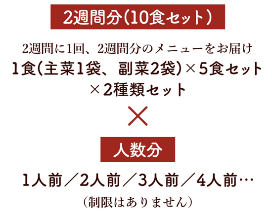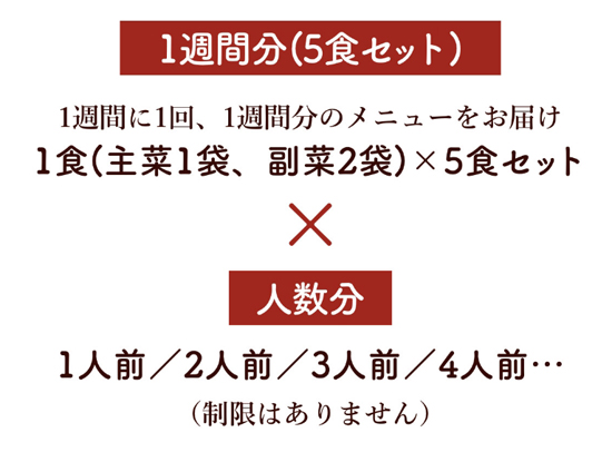 こちらのセット内容は、主菜1品と副菜2品が5食セットになって、お得な価格でご提供しています。