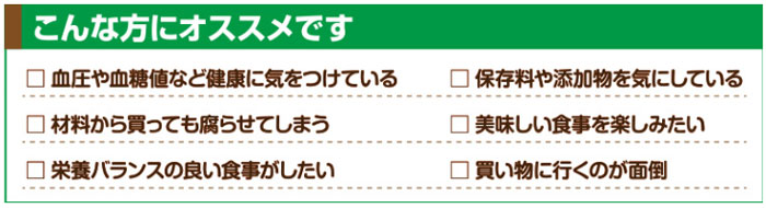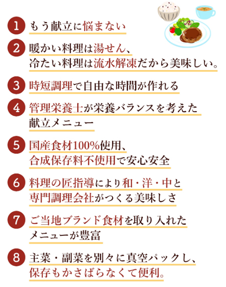 栄養バランスのとれた食事を楽しむことができるだけでなく、毎日の献立を考えて、食材の買出しにいくというわずらわしさからも解放されます。