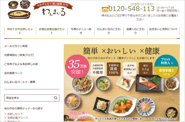 わんまいるは、1988年創業以来「美味しくて健幸」をテーマに、国産食材100%にこだわった冷凍おかずセットを提供している宅配サービスだ。